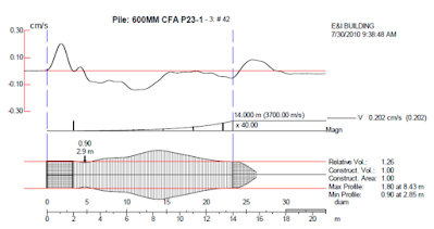 - Gelombang kejut primer yang merambat sepanjang tiang dipantulkan dari ujung kaki akibat perubahan densitas antara beton dan lapisan tanah di bawahnya. Namun, jika tiang memiliki cacat atau diskontinuitas dalam panjangnya, ini akan membentuk pantulan sekunder yang akan ditambahkan ke sinyal balik.